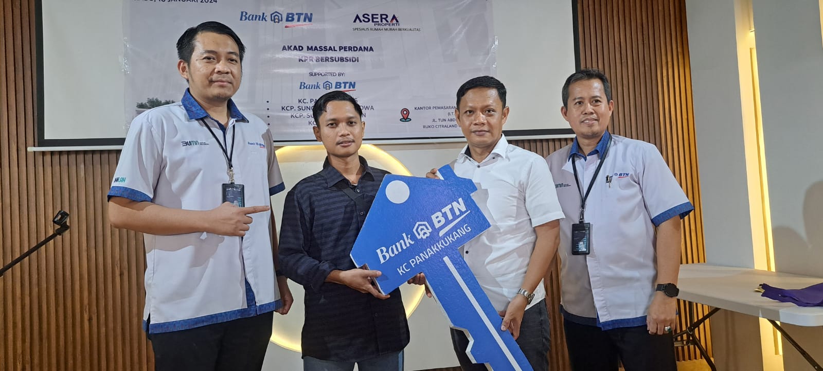 BERITA45.COM, MAKASSAR - Asera Properti dan BTN KC Panakkukang menggelar Akad KPR Massal bersama puluhan user di kantor pemasarannya, Jalan Tun Abdul Razak, Ruko Citraland Celebes K-15 Kabupaten Gowa, Rabu (10/1/2024).